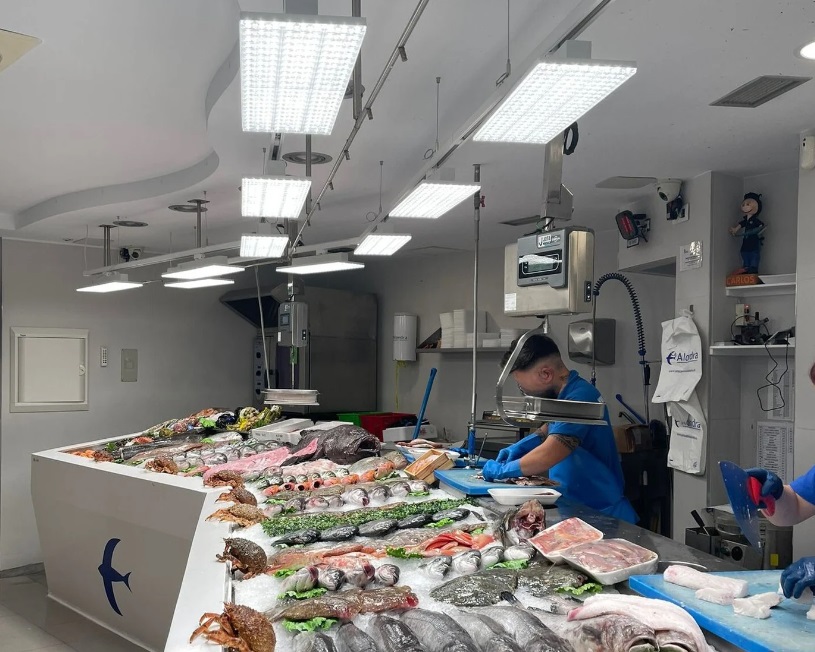 La sección de pescadería de cualquier supermercado o puesto en el mercado local, necesita una iluminación especial, para este tipo de producto ya bien sea pescado entero, pescado al corte o marisco. El pescado es un producto delicado que debe iluminarse de forma muy especial y específica de entre 4000K y 5000K pero sobre todo con un índice de color alto CRI 90 o 95.